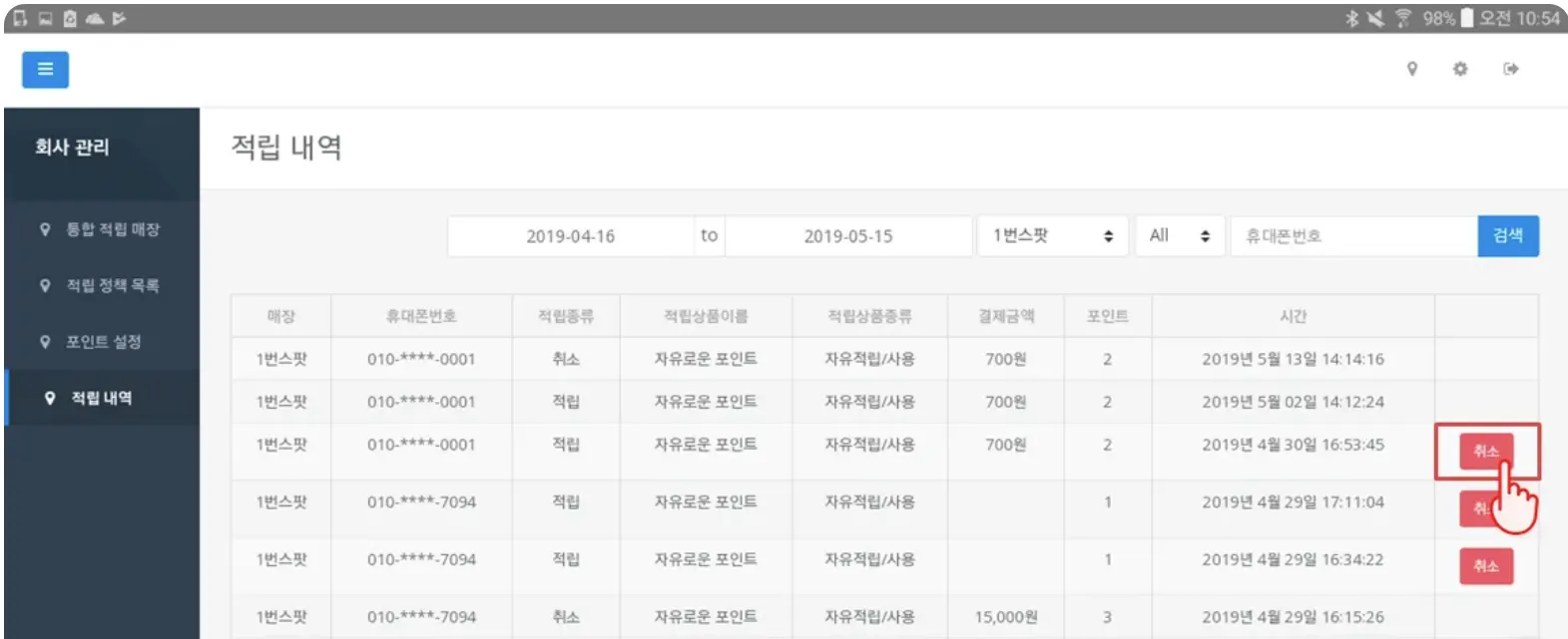 적립을 취소할 고객의 휴대폰 번호 뒷자리를 검색하시면, 해당 고객을 쉽게 찾으실 수 있습니다.
