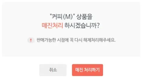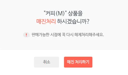 ③ 매진 처리 : 상품 옆에 매진 버튼을 누르시면 아래 화면이 팝업으로 노출되고 매진 처리하기 버튼을 눌러 주시면 됩니다. 완료가 되면 빨간색 매진 글자가 활성화 되어 있습니다.