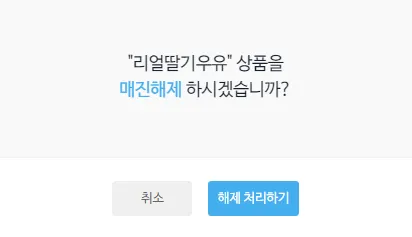 ④ 매진 해제 처리 : 상품 옆에 해제 버튼을 누르시면 됩니다. 해제 버튼을 누르면 아래 화면이 팝업으로 노출되고 해제 처리하기 버튼을 눌러 주시면 됩니다. 완료가 되면 검정색 해제 글자가 활성화 됩니다 ( ② 참고)