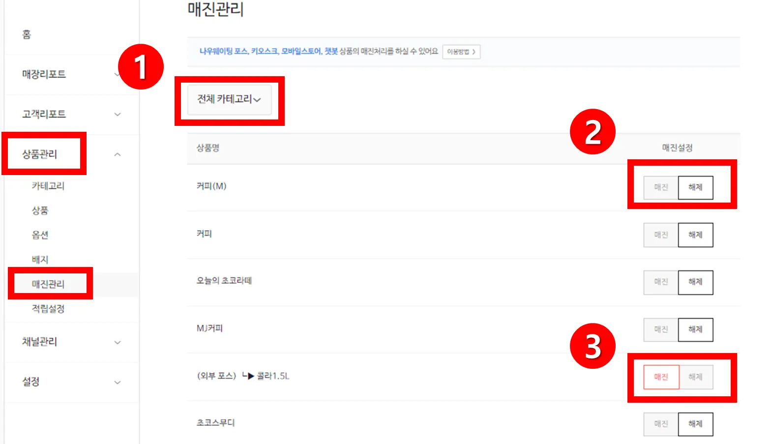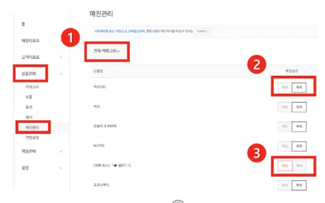 ① 사장님센터 > 상품관리 > 매진관리로 들어가신 후, 전체 카테고리를 눌러 매진 처리할 상품의 카테고리를 클릭해 주세요.