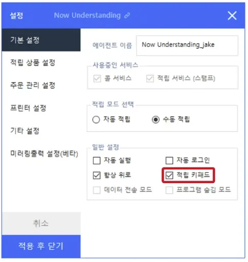 2) PC 프로그램의 설정 페이지에 적립 키패드를 체크 후 [적용 후 닫기] 버튼을 눌러주세요.
