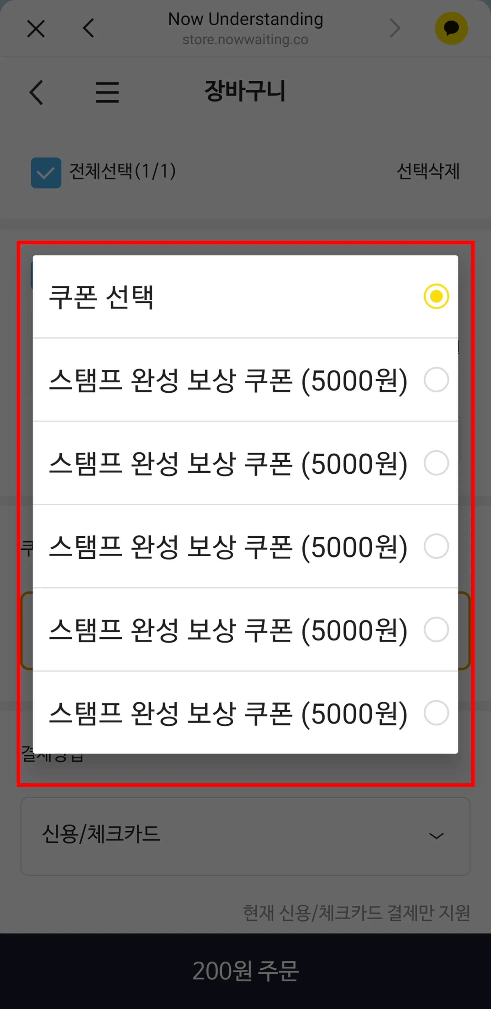 스탬프를 적립하시고 쿠폰 발급을 받으신 고객님은 아래와 같이 보유 쿠폰를 확인하시고 주문화면에서 바로 쿠폰 사용이 가능합니다!