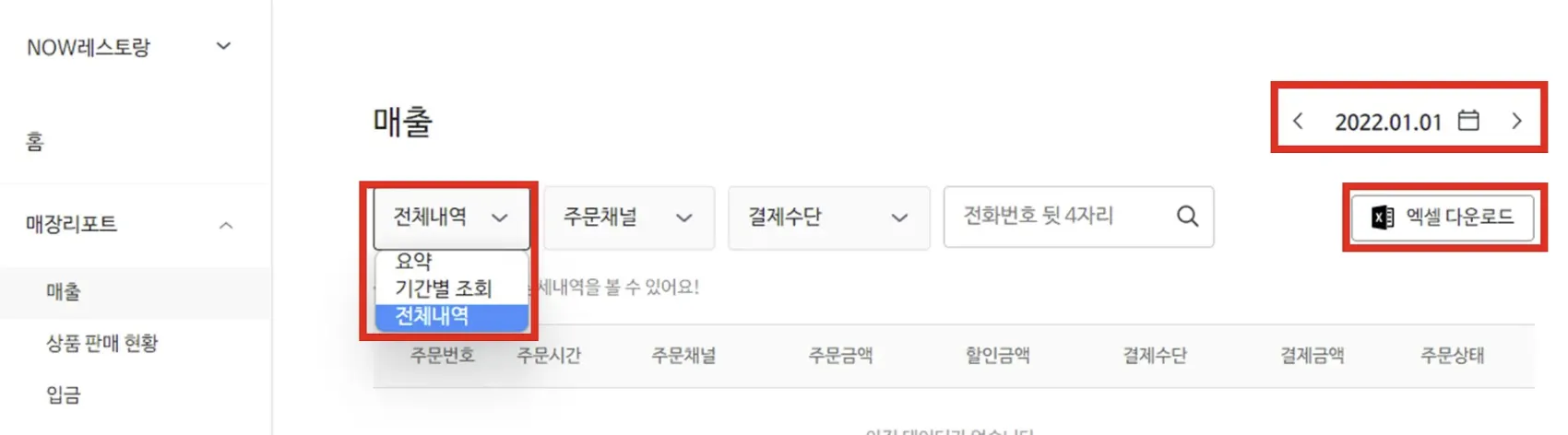 사장님센터에서 보여지는 매출은 PC에서 엑셀로 다운받을 수 있습니다.