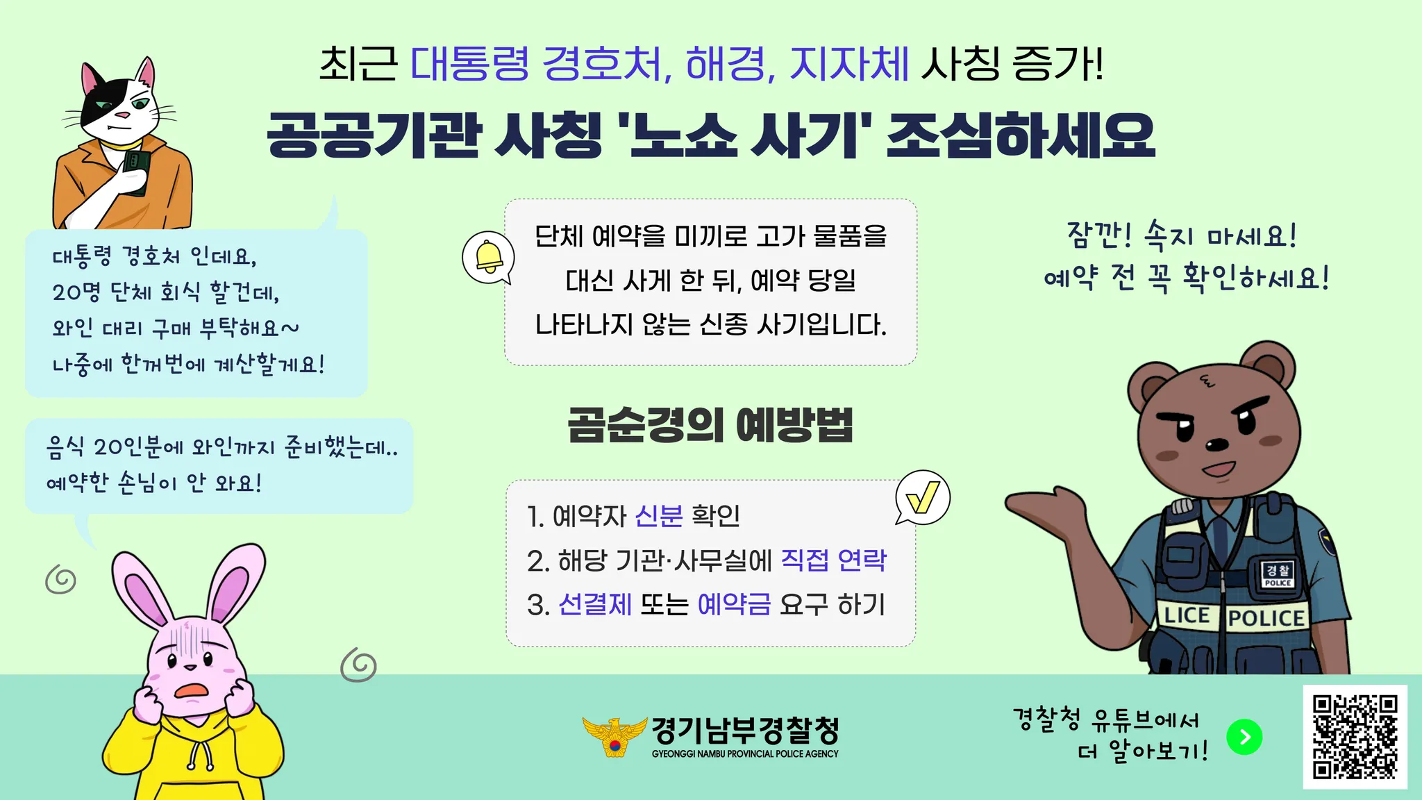 최근 대통령 경호처, 해경, 지자체 등 공공기관을 사칭한 단체 예약 ‘노쇼 사기’ 사례가 늘고 있습니다.