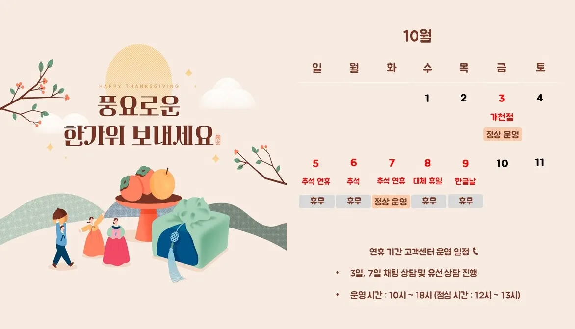 10월 고객센터 운영 및 휴무일 안내드립니다.
