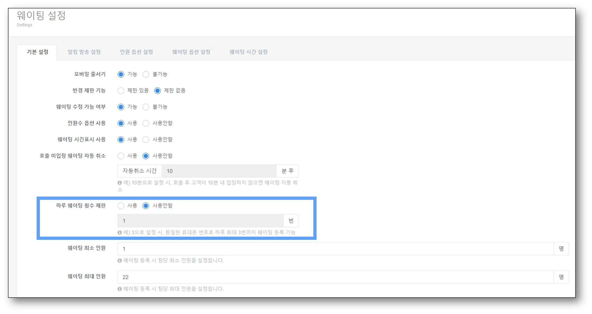 하루 웨이팅 횟수 제한 > 사용에 체크하신 후 횟수를 입력해 주세요.