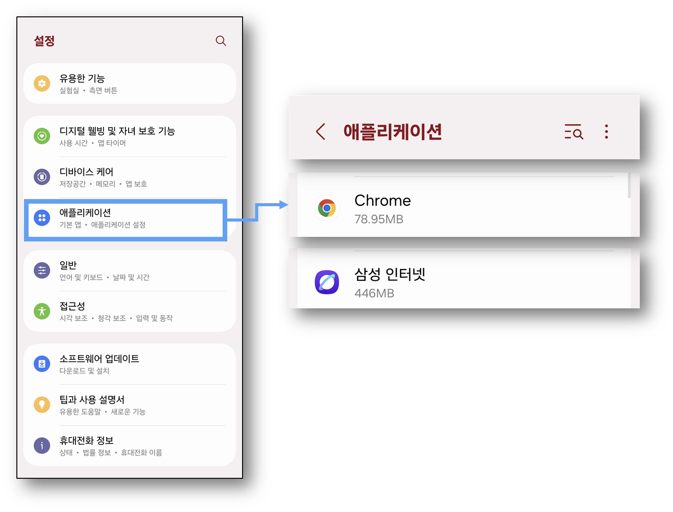 2) 휴대폰 > 휴대폰의 설정 > 애플리케이션 > Chrome(크롬) 혹은 삼성 인터넷