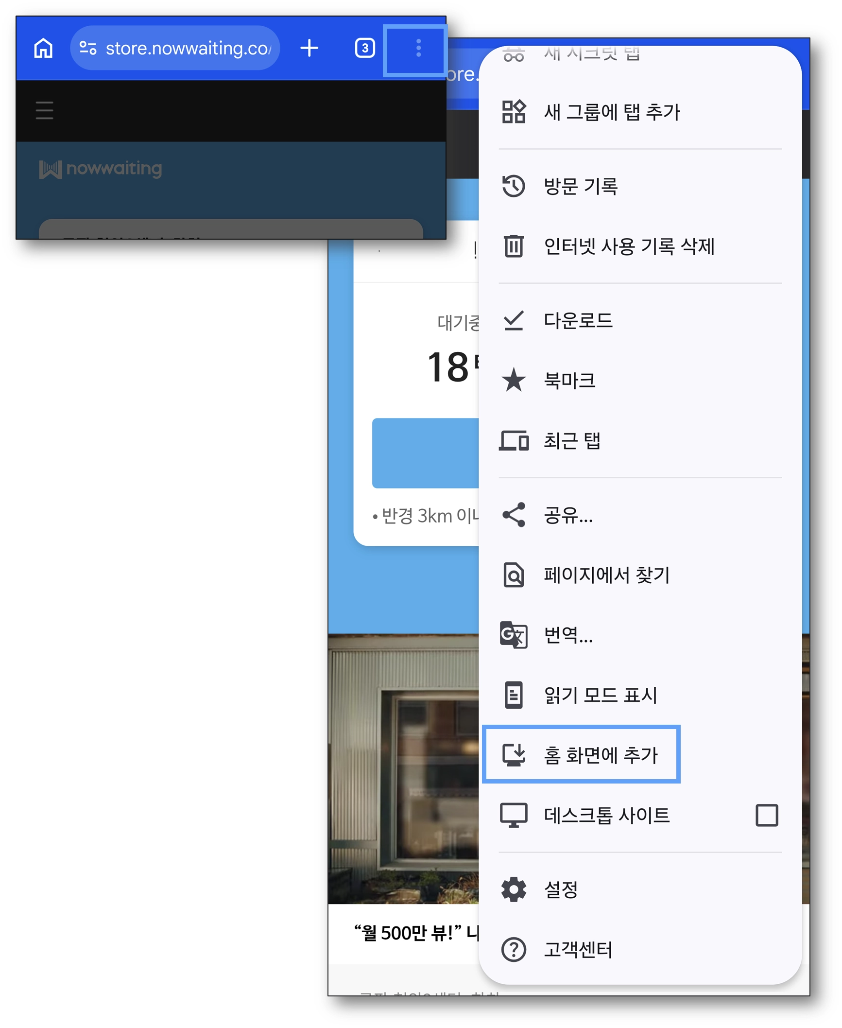 상단 점 세개 > 홈 화면 추가