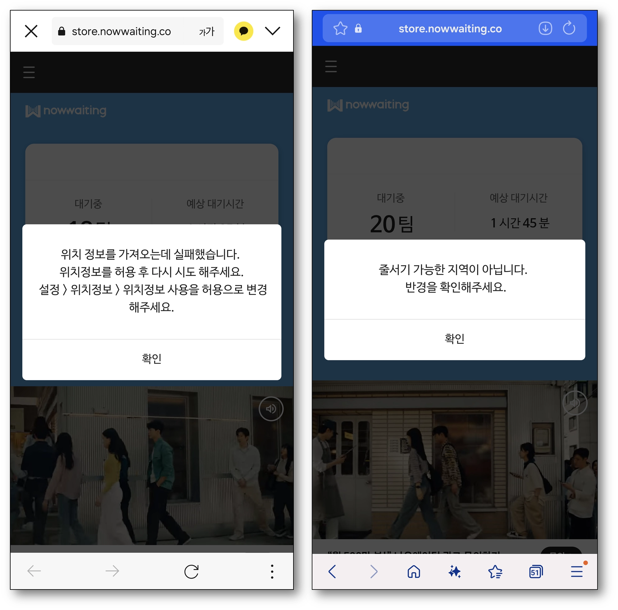 원격 웨이팅 반경 제한이 설정되어있는 매장의 경우, 아래와 같은 상황에서는 웨이팅이 불가합니다.