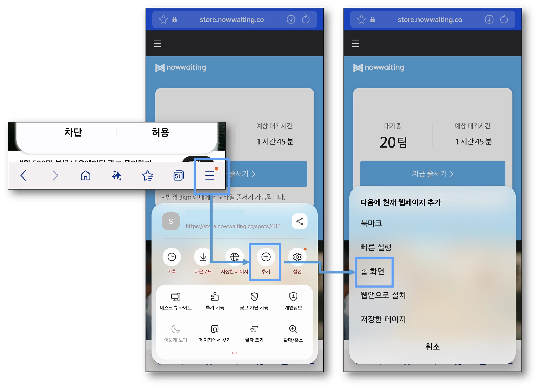 하단 三 > 추가 > 홈 화면 클릭