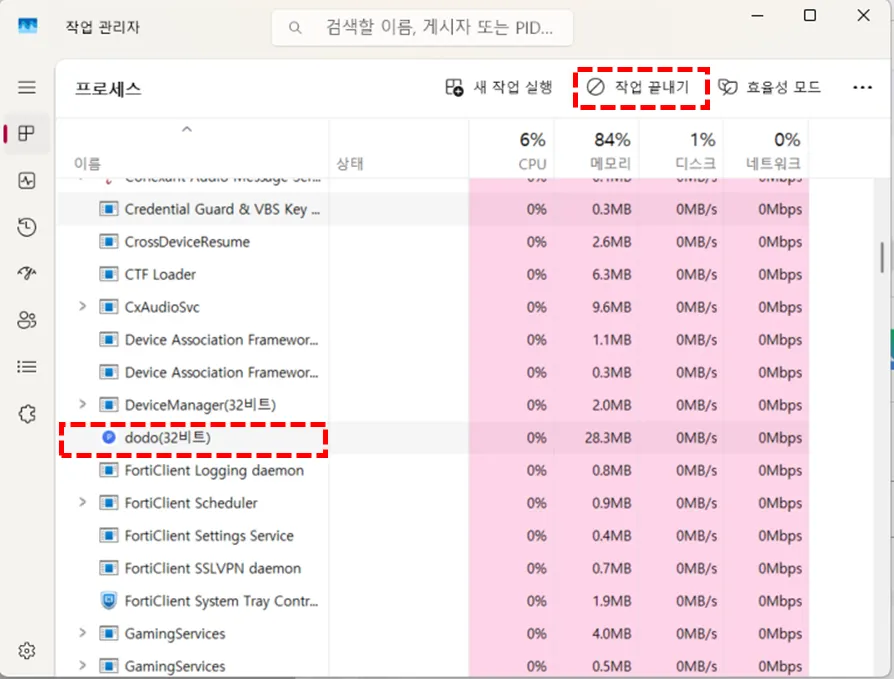 프로세스 탭에서 dodo.exe를 선택한 뒤 프로세스 끝내기를 눌러주세요.