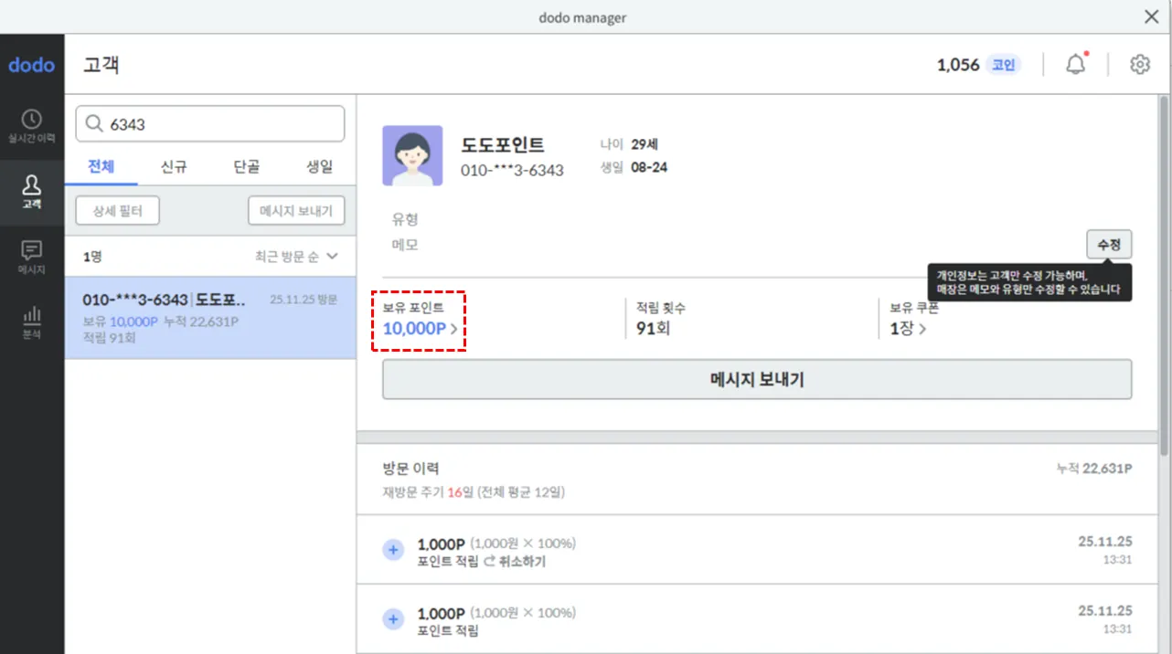 - 고객 상세 화면에서 보유 포인트를 클릭합니다.