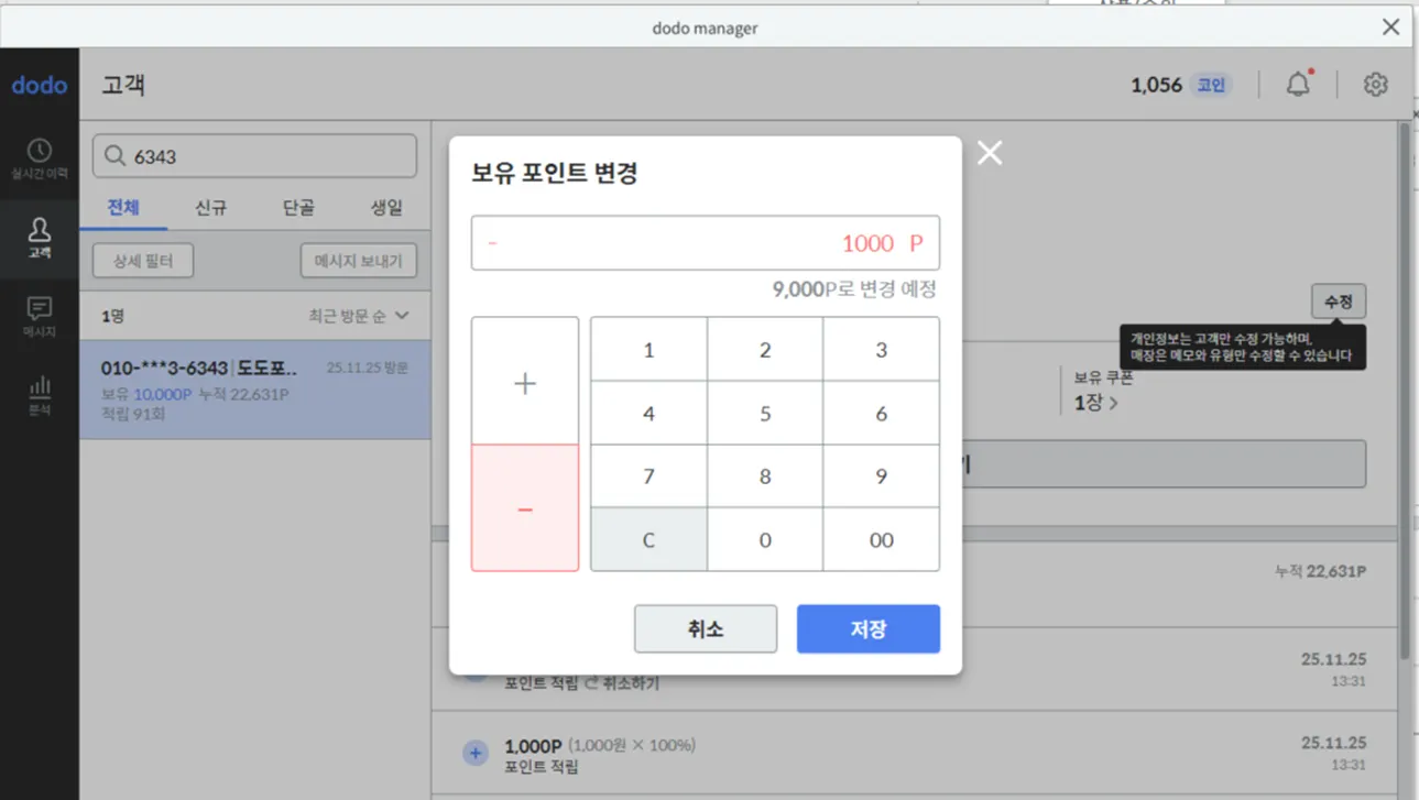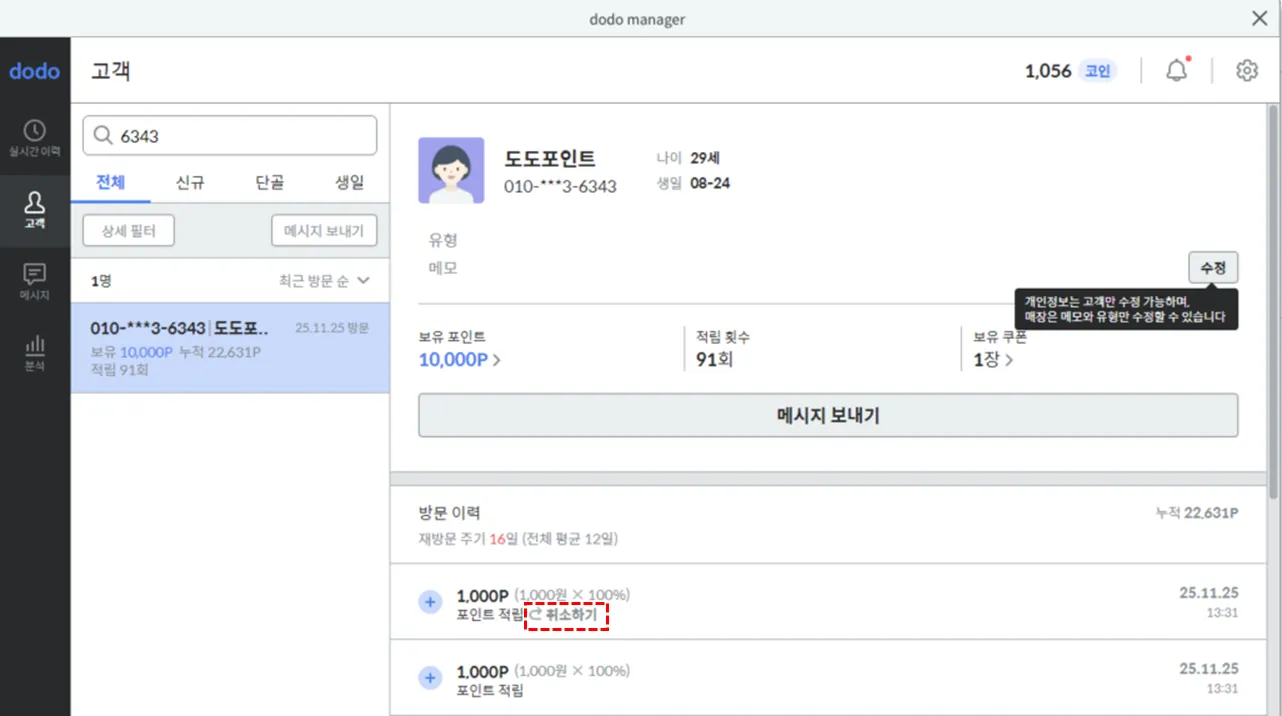 잘못 적립된 포인트는 방문 이력의 취소 하기 버튼 또는 보유 포인트 직접 조정을 통해 수정할 수 있습니다. 아래 순서에 따라 상황에 맞는 방법으로 처리해 주세요.