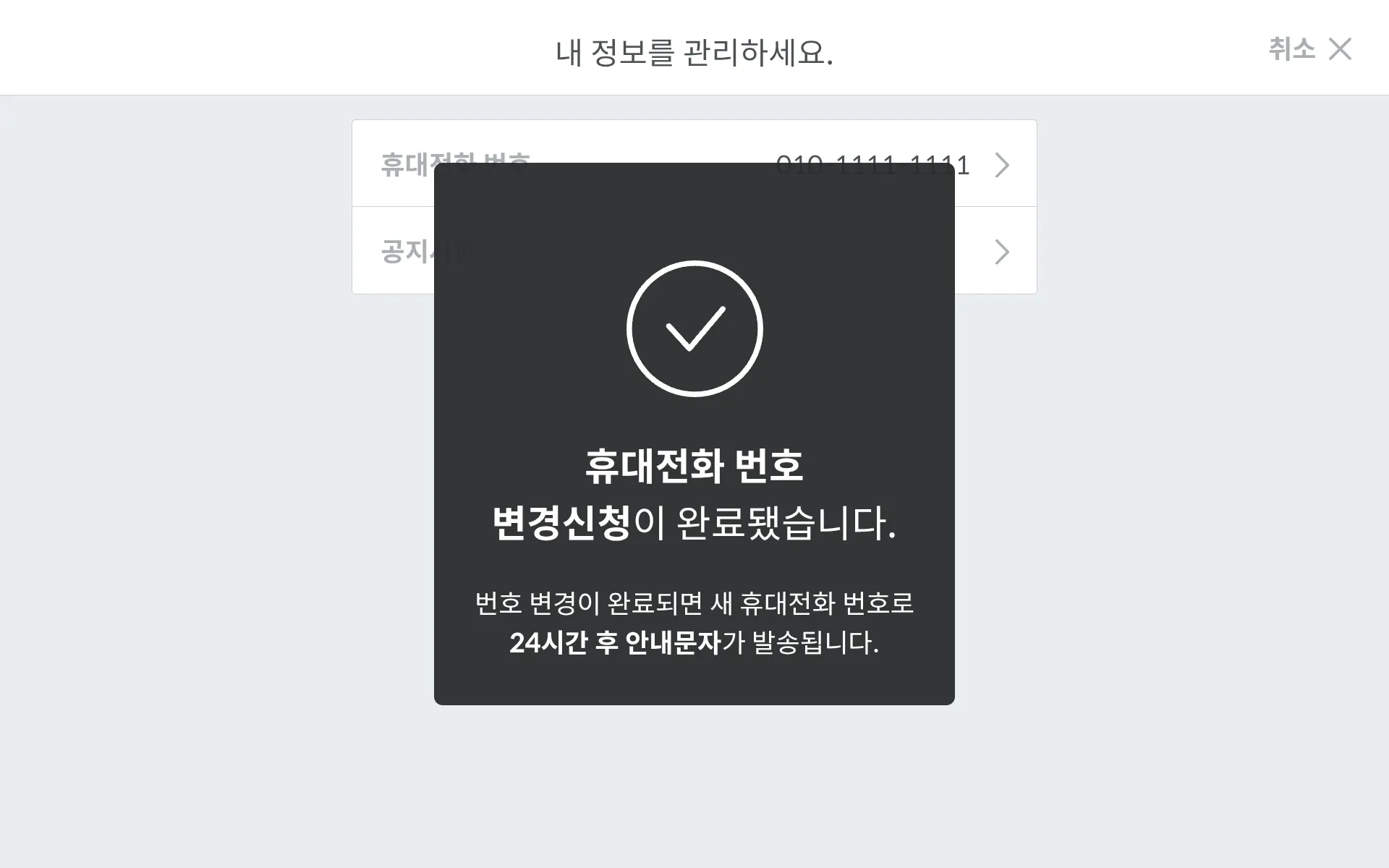 휴대전화 번호 변경은 영업일 기준 최대 24시간 안에 검수가 완료되며,