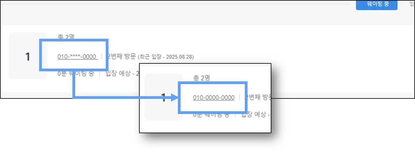 고객님의 웨이팅 카드에 연락처를 클릭하여 해당 고객님의 번호로 정상적으로 웨이팅이 되었는지 확인해 주시기 바랍니다.