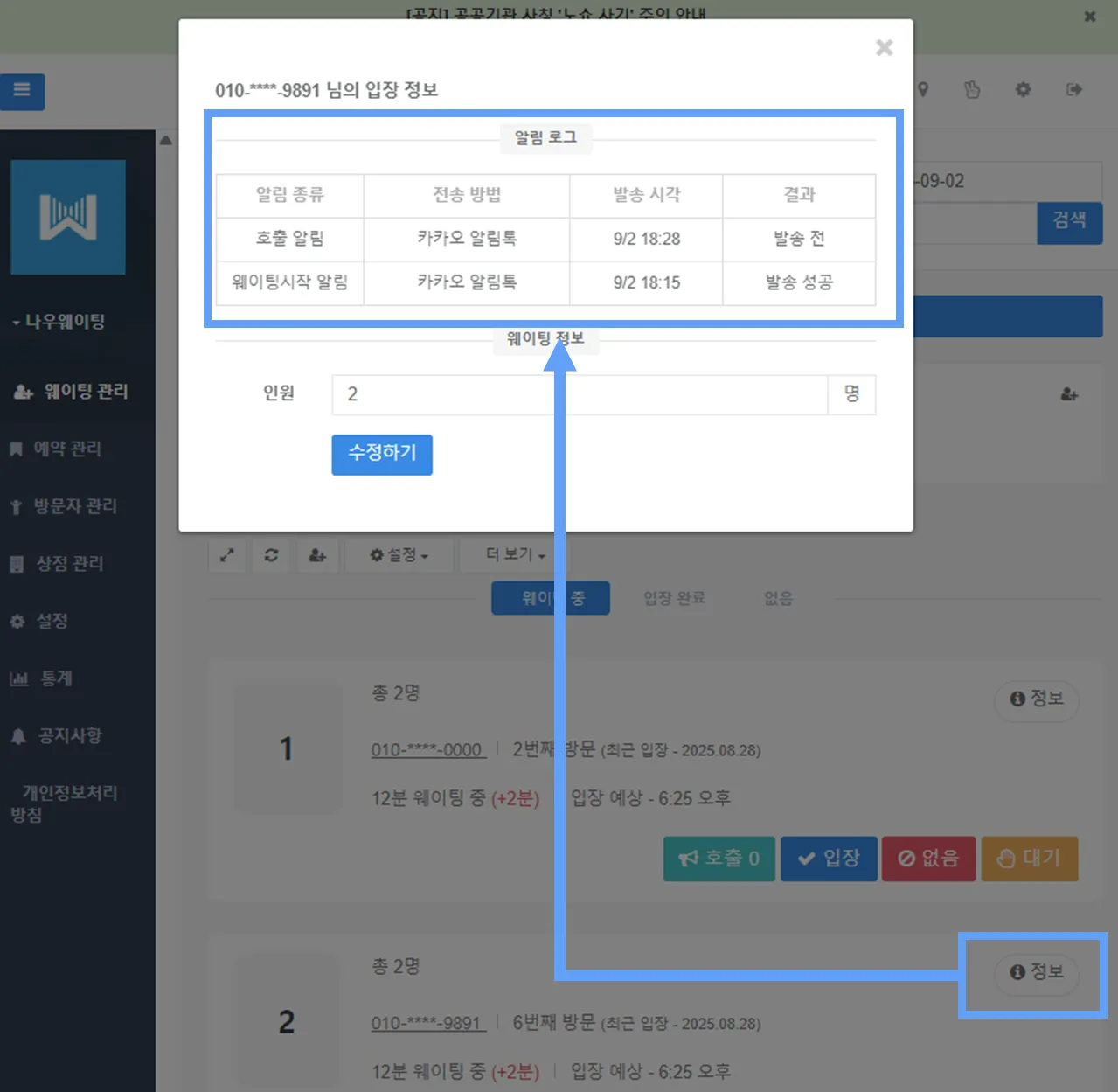 1) 웨이팅 관리 페이지에서 해당 고객의 웨이팅 번호 / 전화번호를 확인 후, 정보 버튼을 누릅니다.