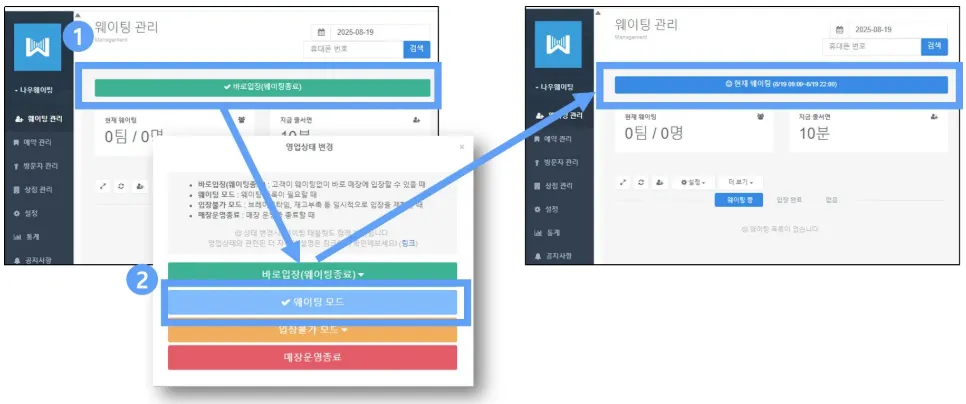 영업 시작 시간이 되면 기본적으로 [바로입장] 모드로 시작됩니다. 웨이팅 여부는 매장 상황에 따라 다르기 때문에 영업 상태는 수동으로 관리해 주셔야 합니다.