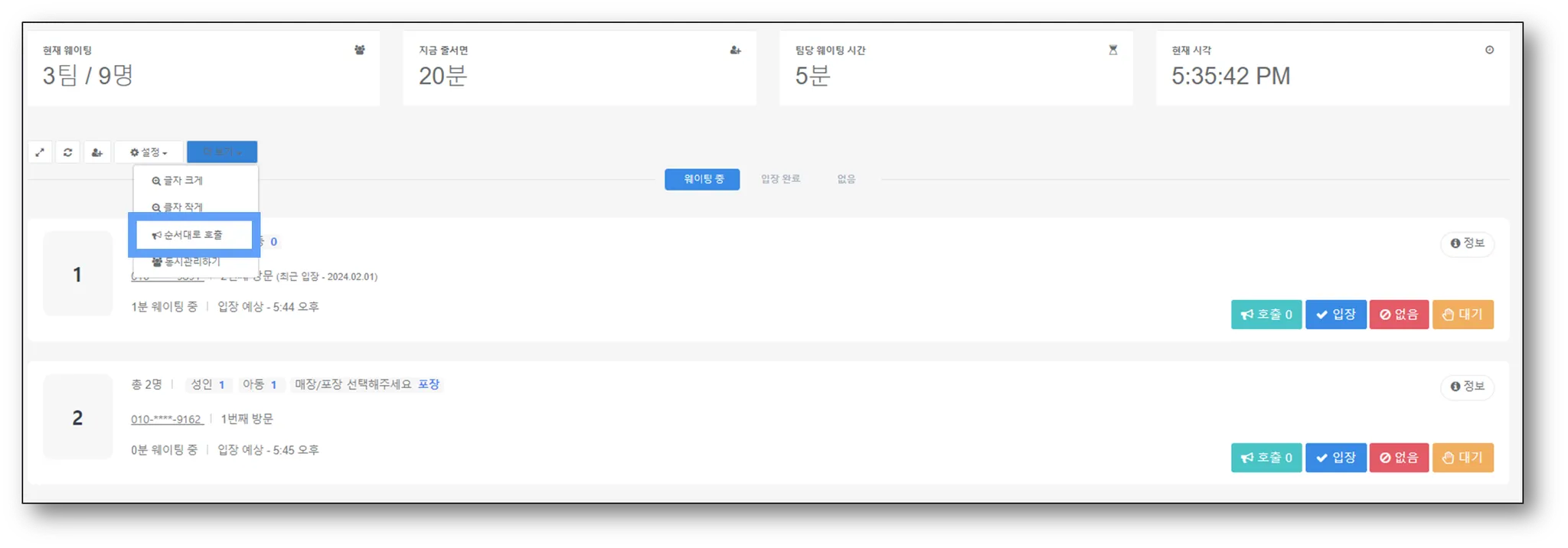 2)웨이팅 어드민 왼쪽의 '더보기'를 누른 뒤, [순서대로 호출] 을 누릅니다.