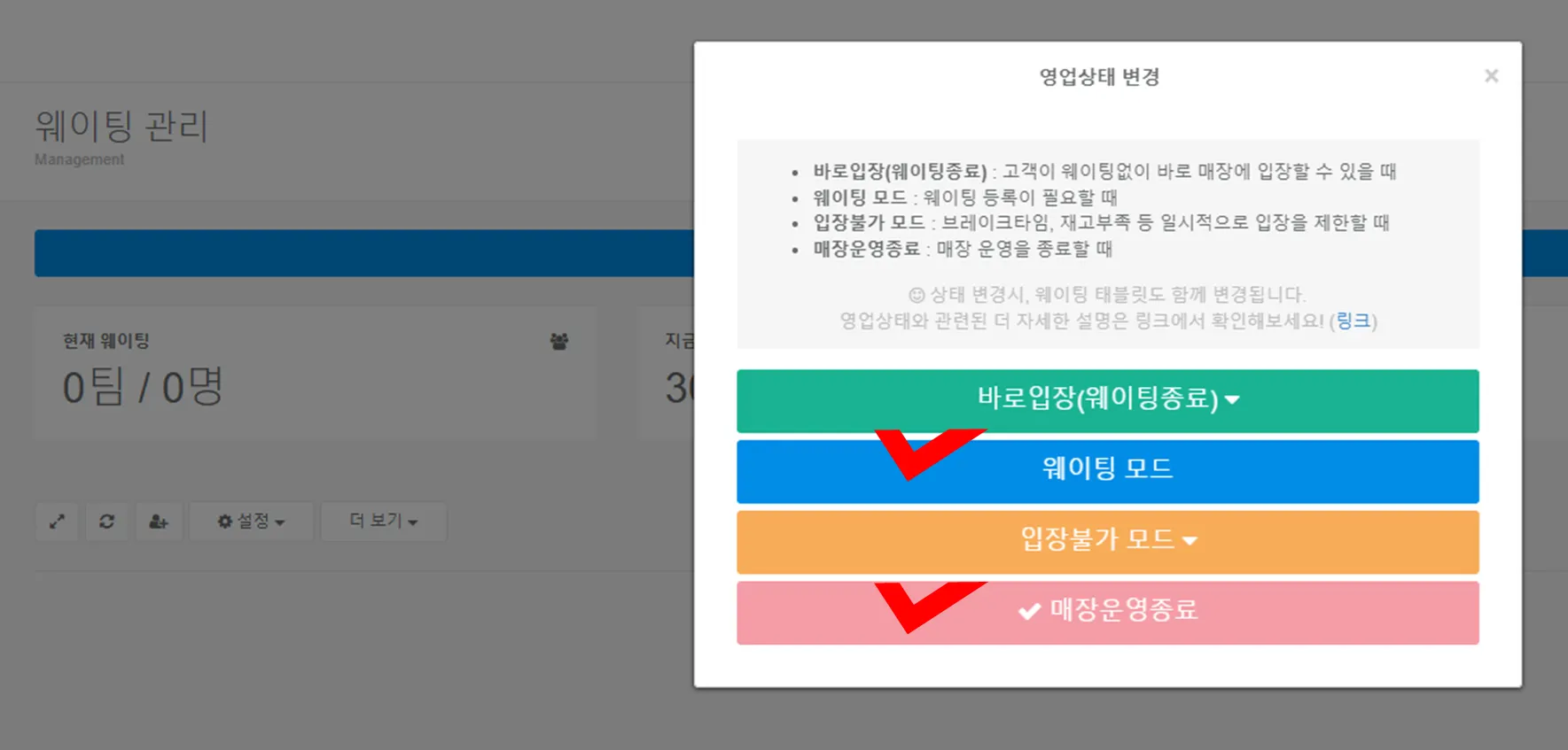 웨이팅 접수가 안되는 경우 영업 상태를 확인해 주세요.