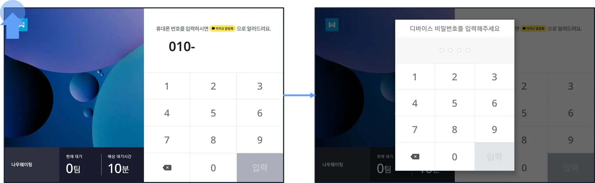 (초기 비밀번호는 0000이며, 비밀번호는 웨이팅 어드민 > 설정 > 기본설정 > 디바이스에서 변경 가능합니다)