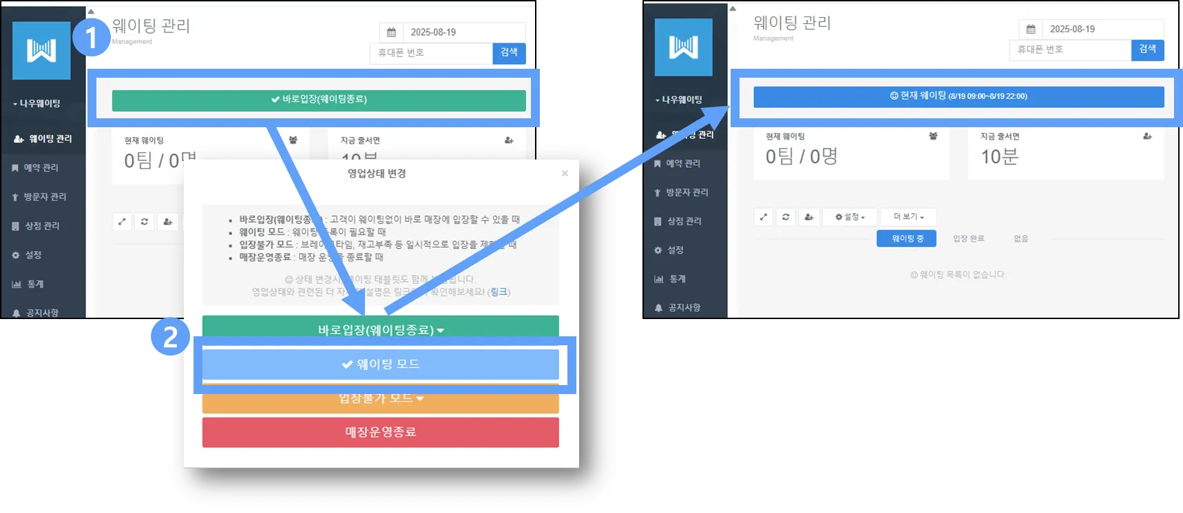 영업 시간 수정 후에는 영업 상태바를 [매장운영종료] > [웨이팅 모드] 로 변경해 주셔야 합니다.