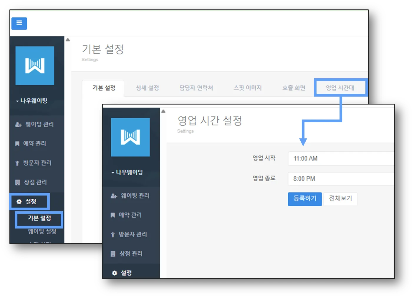 웨이팅 어드민( https://nowwaiting.co ) > 설정 > 기본설정 > 영업시간대 > 영업시간대 수정 버튼을 눌러 요일별 영업시간을 확인해주세요.