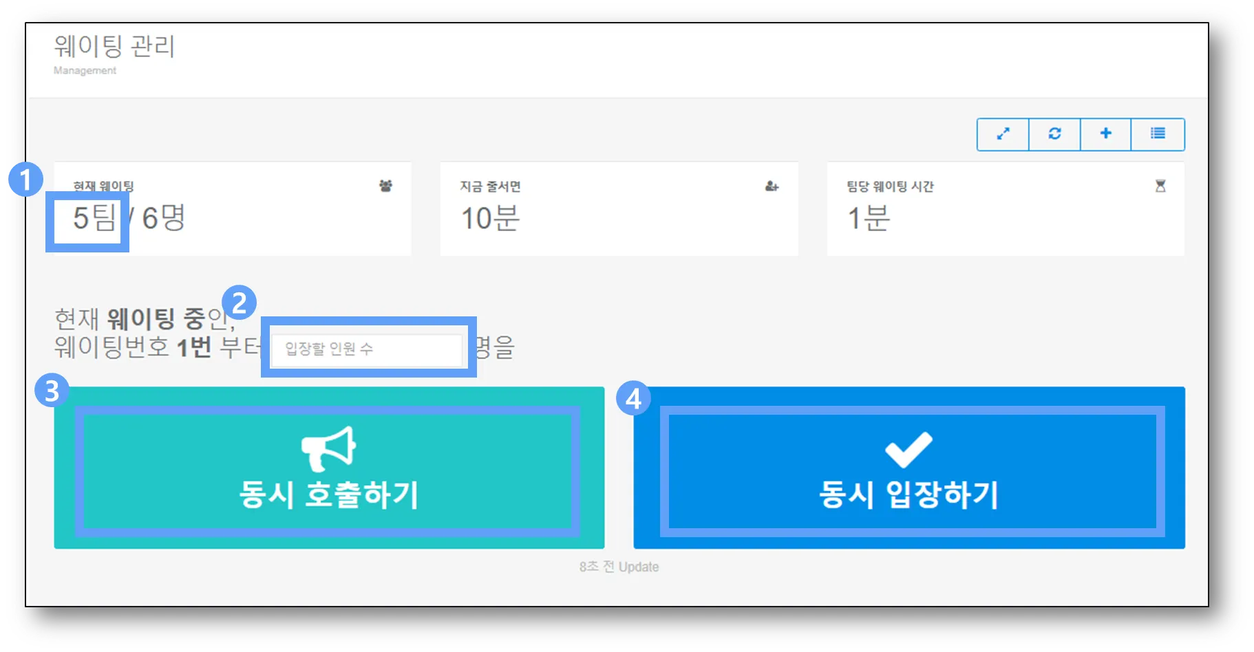 2. 반드시 동시 호출하기 → 동시 입장하기 순서대로 진행해야 고객들에게 호출 알림톡이 발송됩니다.