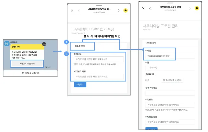 비밀번호 재설정 링크에서 휴대전화번호를 입력하면 카카오톡으로 비밀번호를 변경할 수 있는 링크를 보내드립니다.