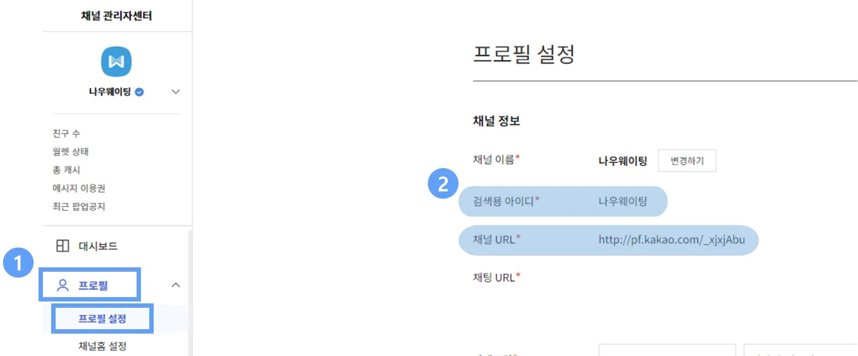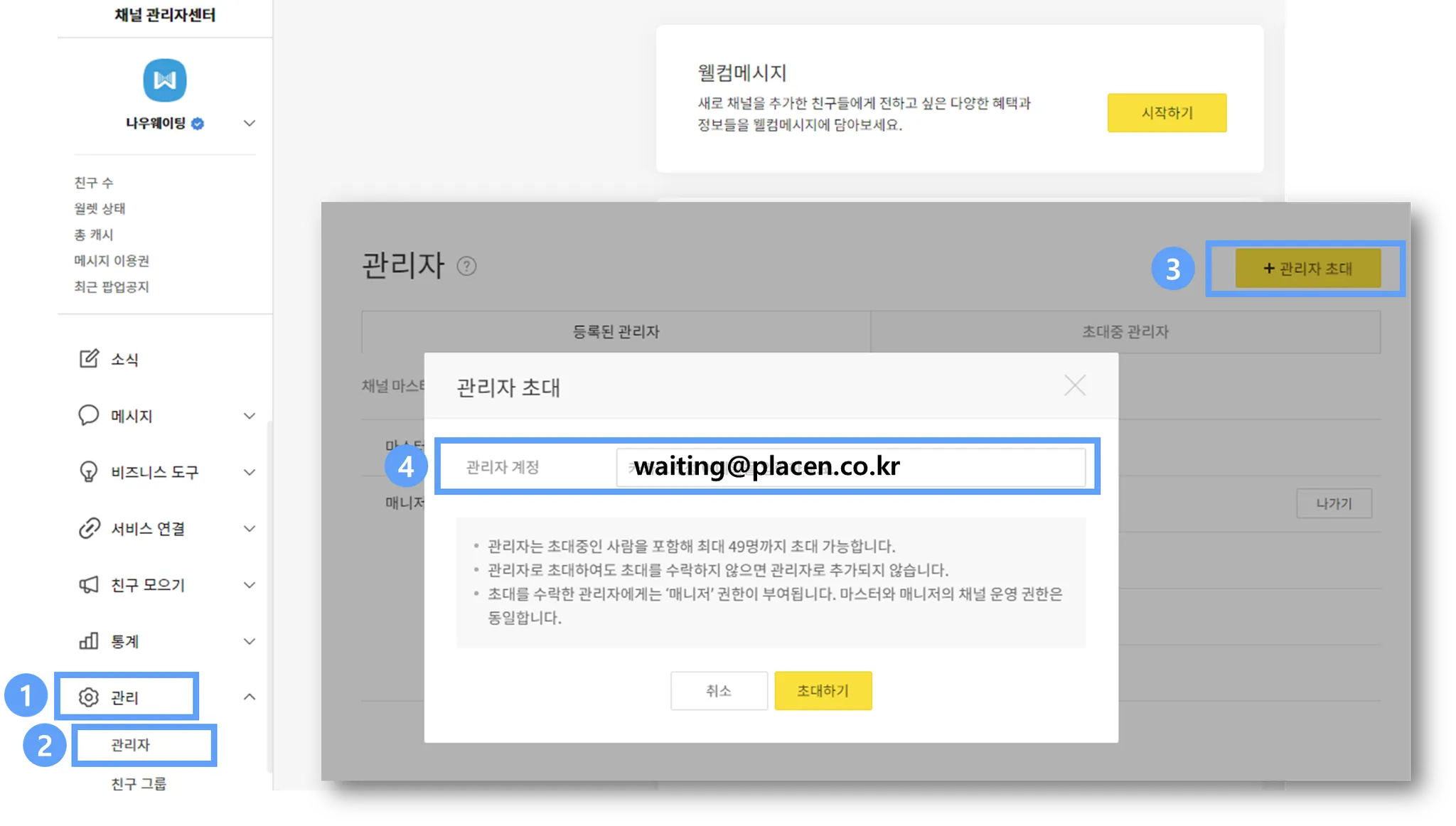 나우웨이팅에 매장 채널을 연동하기 위해서는 매장 카카오 채널 관리자 센터에서 나우웨이팅의 관리자 계정을 초대해 주셔야 합니다.