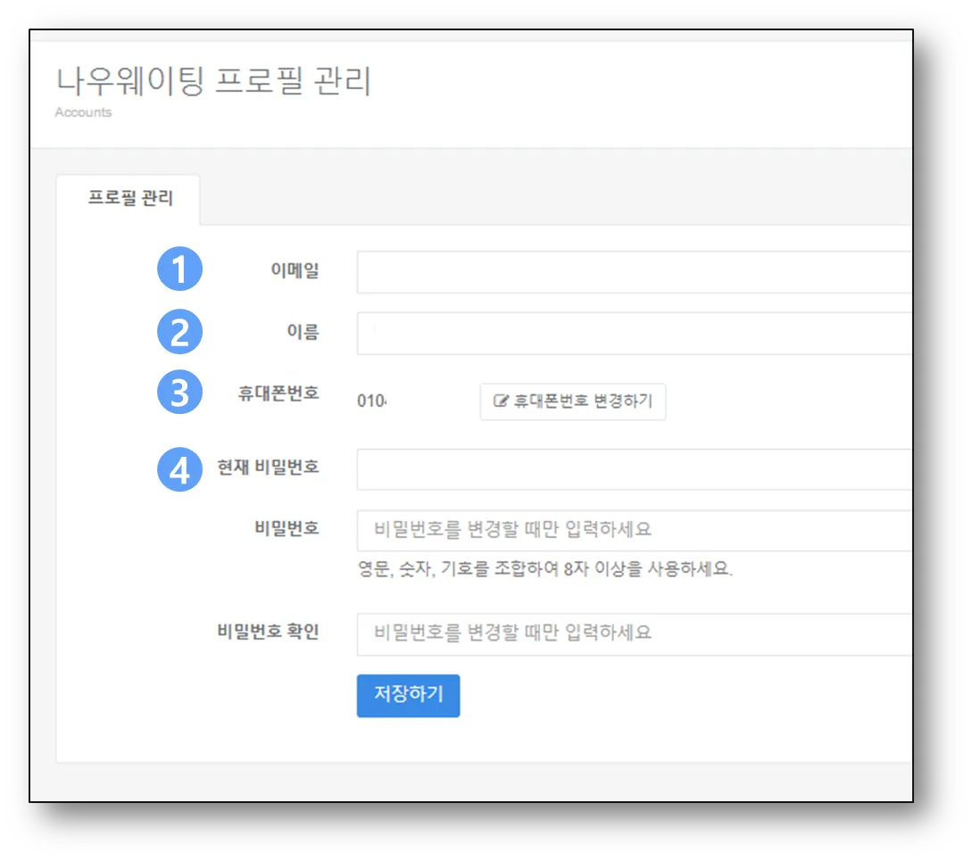 내 번호로 등록되어있는 관리자 계정의 아이디(이메일), 휴대폰 번호, 비밀번호를 웨이팅 어드민에서 직접 변경할 수 있습니다.