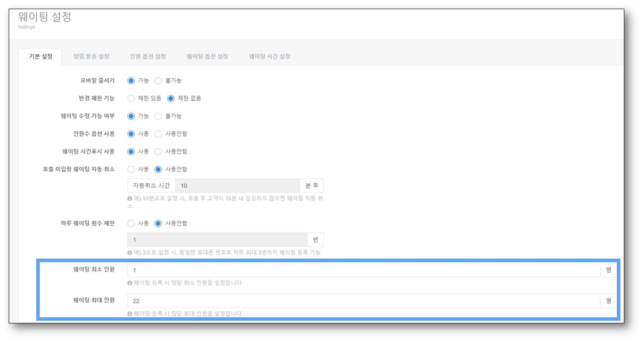 웨이팅 어드민 > 설정 > 웨이팅 설정 > 기본설정