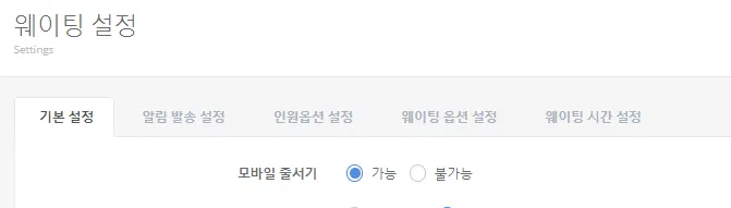 웨이팅 어드민 > 설정 > 웨이팅 설정 > 기본설정 > 모바일 줄서기 버튼 메뉴를 가능으로 체크 후 저장합니다.