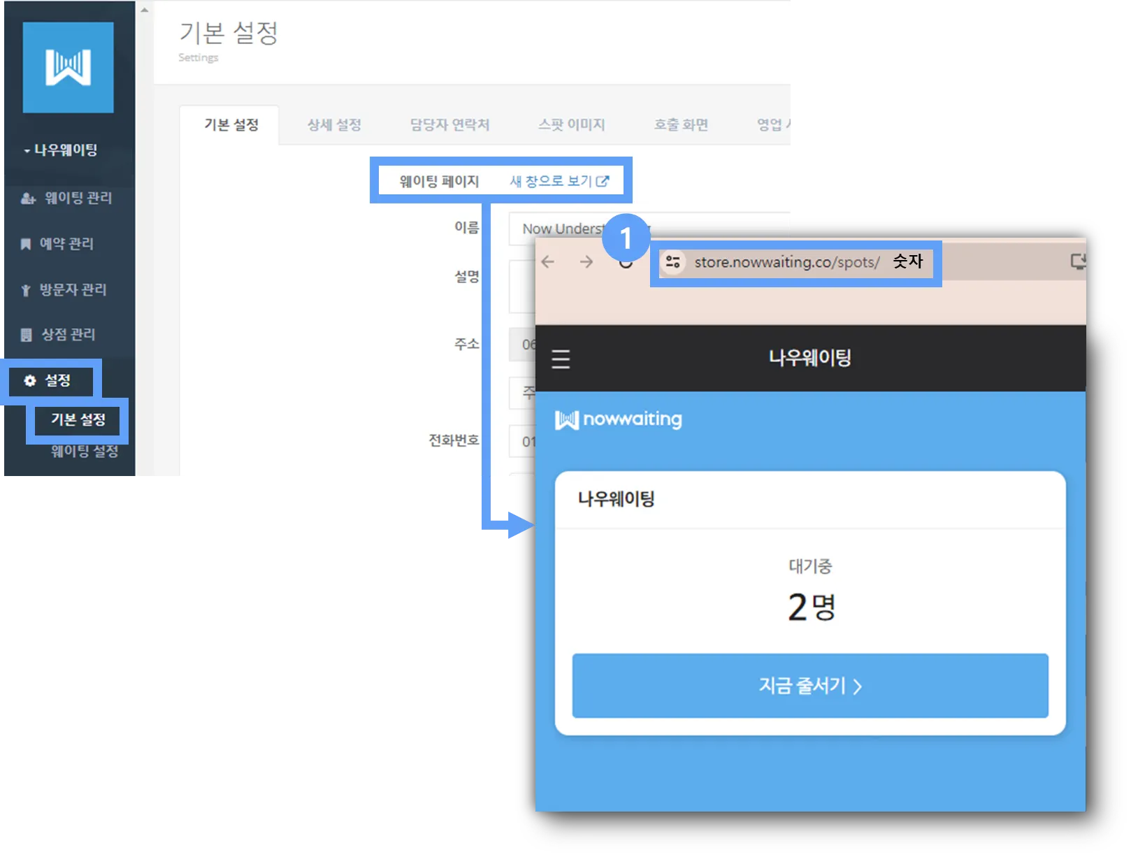 1) 웨이팅어드민 > 설정 > 기본설정 > 웨이팅 페이지 [새 창으로 보기] 클릭후 노출되는 창의 ① 주소를 복사하여 외부에 노출해 주세요.