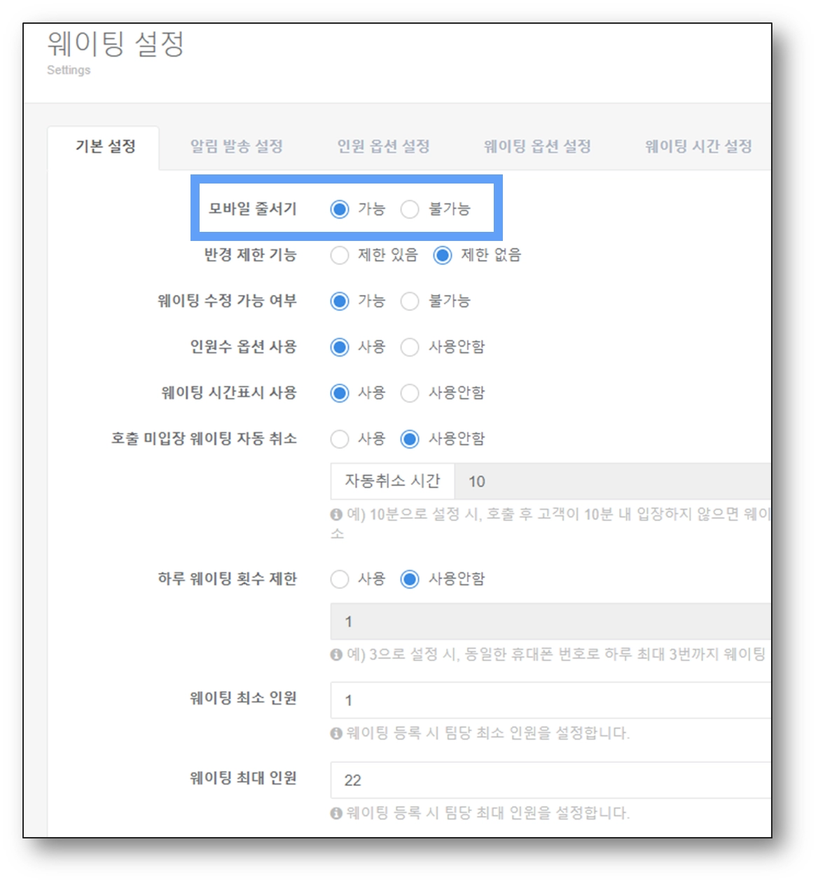 해당 기능을 원하시지 않는다면 모바일 줄서기 버튼을 "불가능"으로 변경해주세요.