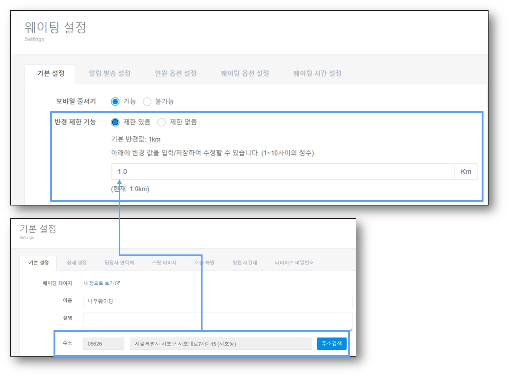 2) 반경 제한 기능은 모바일 웨이팅(원격 웨이팅)은 매장 주소(웨이팅 어드민 > 설정 > 기본 설정에 등록된 주소)를 기준으로, 휴대폰 위치 서비스를 켠 고객에 한해 반경 Nkm 이내에 있는 경우에만 이용할 수 있도록 설정할 수 있습니다.