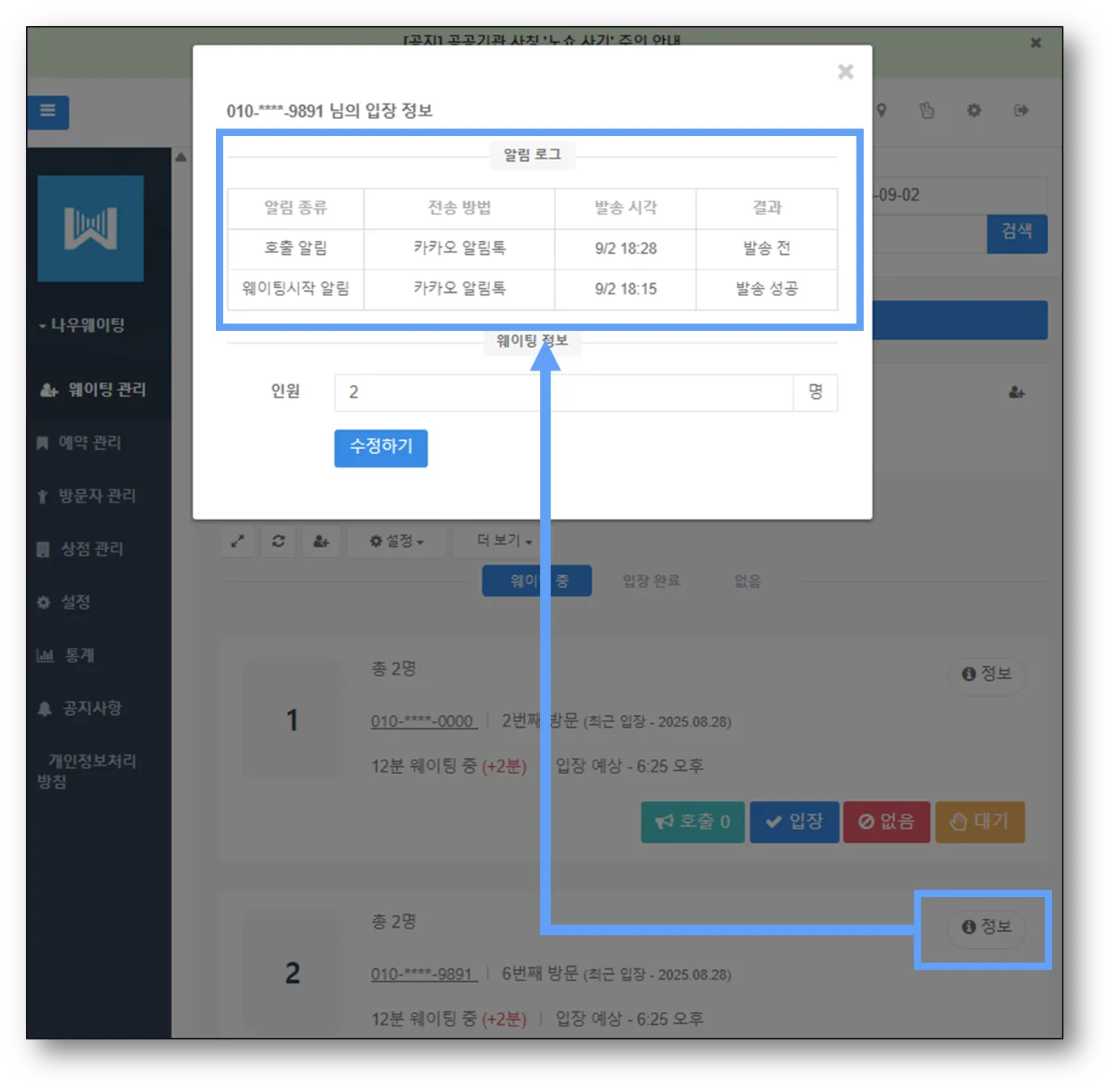 웨이팅 관리 페이지에서 해당 고객의 전화번호를 확인 후, 정보 버튼을 누릅니다.