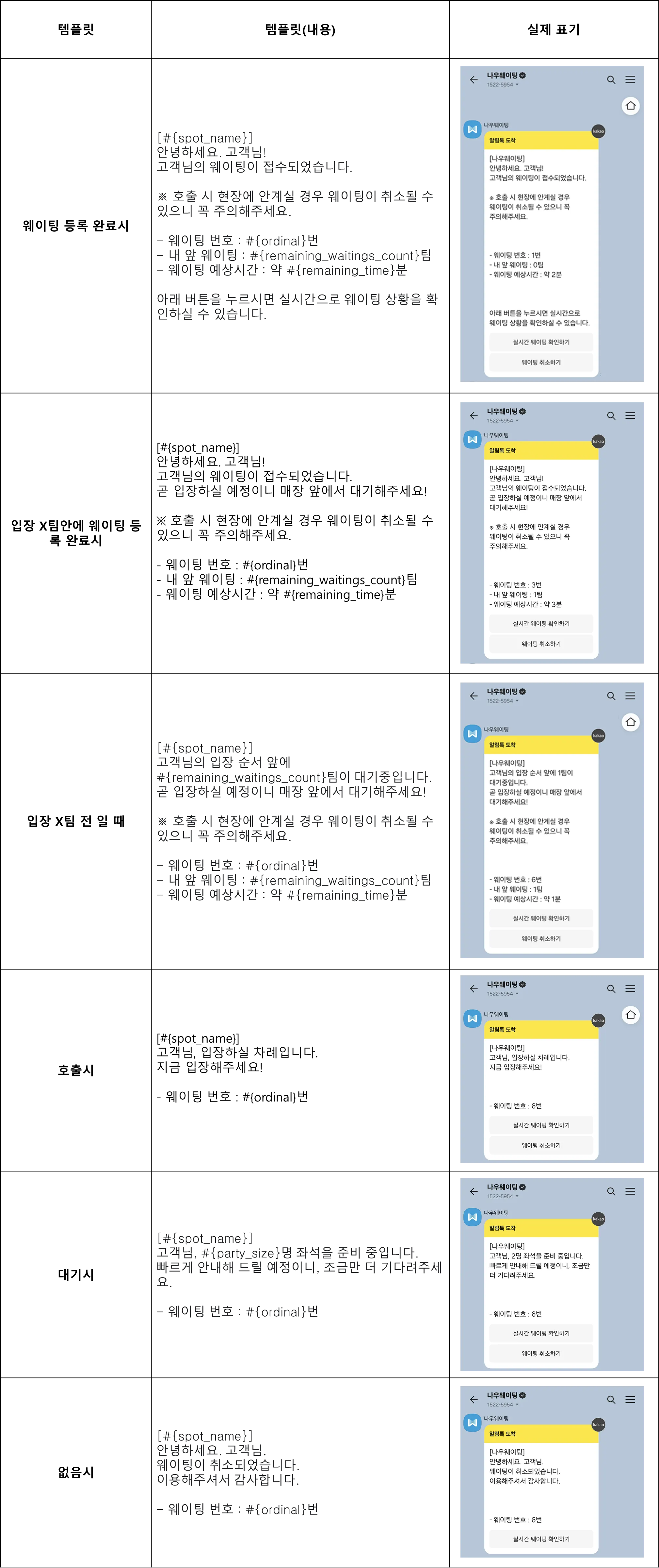 나우웨이팅 채널로 발송되고 있는 기본 알림톡 템플릿 문구를 아래 표에서 확인해 주세요.